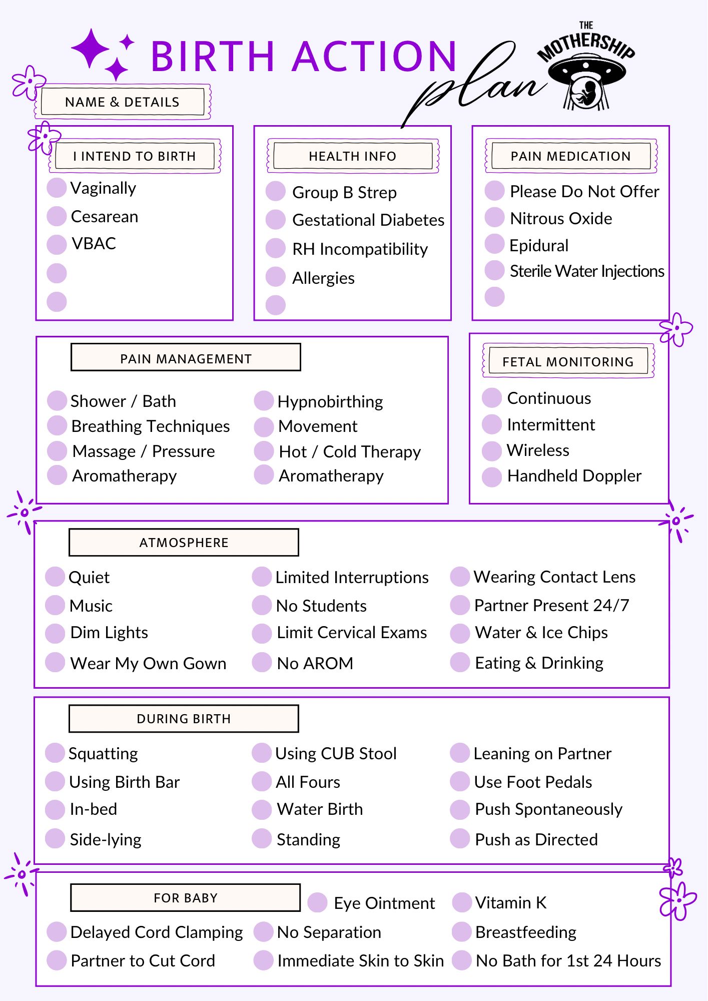 Clearly outline your birth preferences - from pain management to monitoring options - so your care team always knows your wishes.
